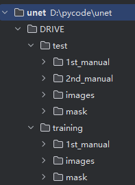 其中1st_manual为第一位眼科医生在原始眼底图像上勾勒的血管像素,被视为“金标准”,2nd_manual为第二位医生独立完成、同样勾勒血管像素的标注,但它存在的意义并不是拿来当训练/测试标签,而是用来衡量不同人工标注者之间的一致性,在此实现中暂时不用管它。