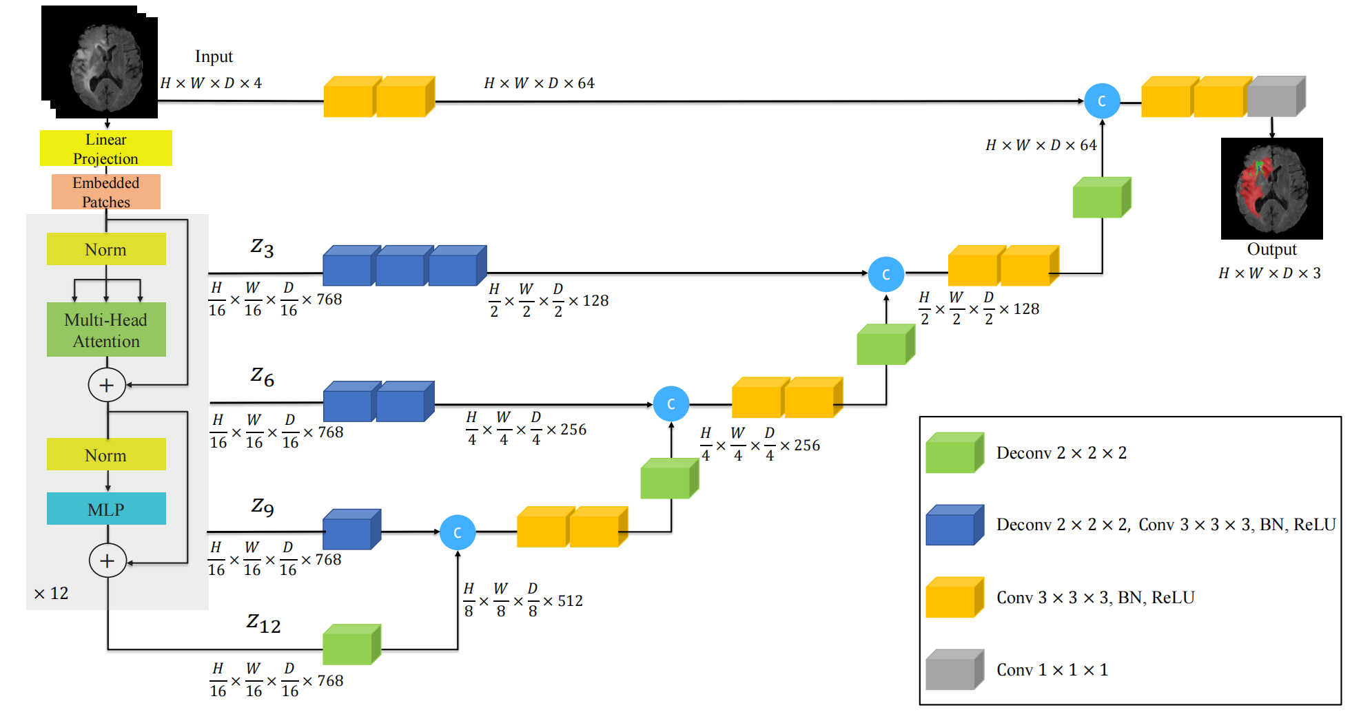 UNETR 保留了 U-Net 的经典 对称 U 型结构: