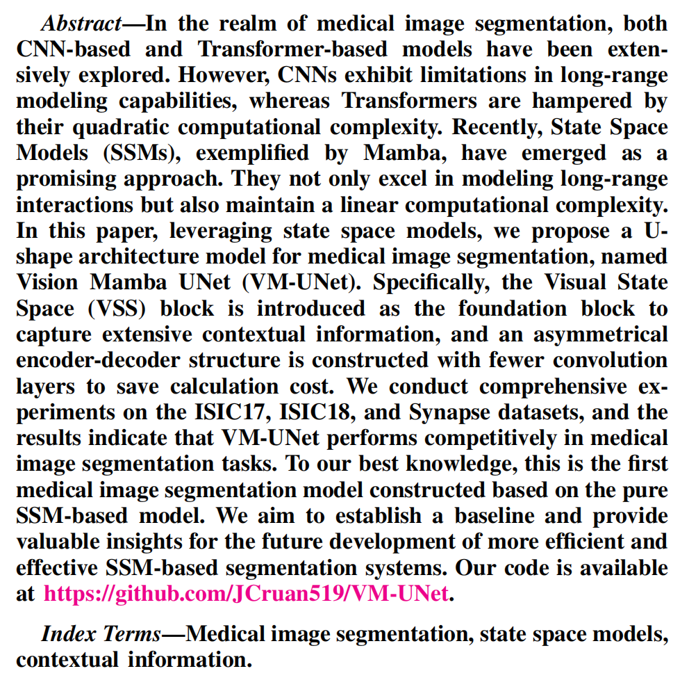 VM-UNet(Vision Mamba UNet)是首个完全基于状态空间模型(State Space Model, SSM)的医学图像分割架构,标志着 Mamba 系列模型在医学影像领域的开创性应用。由上海交通大学研究团队于 2024 年提出。