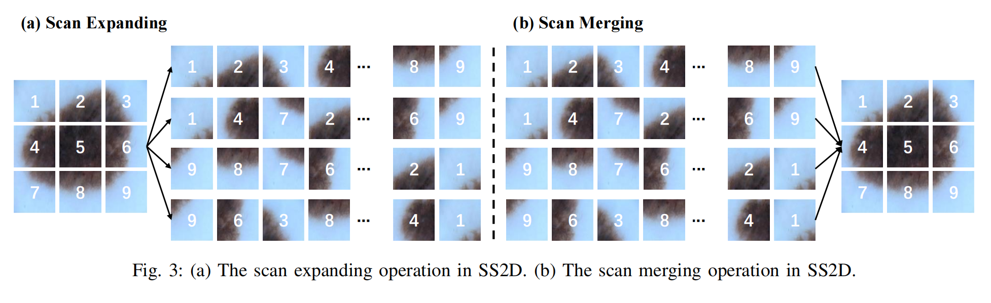 如图 3(a)所示,扫描扩展操作将输入图像沿四个不同方向(左上到右下、右下到左上、右上到左下、左下到右上)展开为序列。然后,这些序列由 S6 块进行特征提取,确保来自各个方向的信息都被充分扫描,从而捕捉多样化的特征。