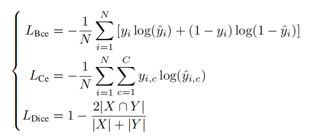 VM-UNet 的引入旨在验证纯 SSM-based 模型在医学图像分割任务中的应用潜力。因此,分别使用最基本的二元交叉熵和 Dice 损失(BceDice 损失)以及交叉熵和 Dice 损失(CeDice 损失)作为二分类和多分类分割任务的损失函数。