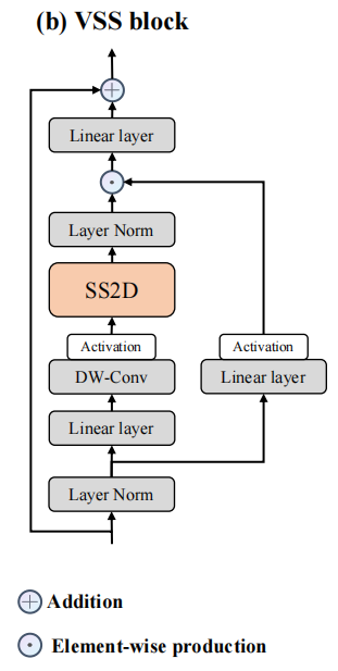源自 VMamaba 的 VSS 块是 VM-UNet 的核心模块,如下图所示: