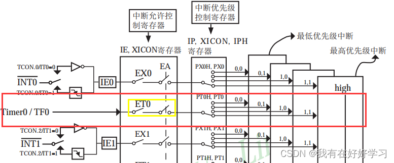 CPU能响应定时器0中断的条件:需要配置IE寄存器的 bit1: ET0 bit7:EA