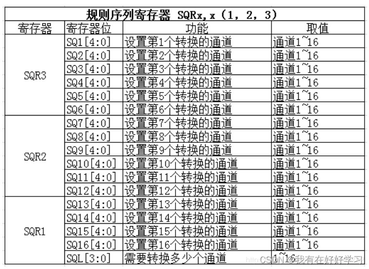 规则通道中的转换顺序由三个寄存器控制:SQR1、SQR2、SQR3,它们都是32位寄存器。SQR寄存器控制着转换通道的数目和转换顺序,只要在对应的寄存器位SQx中写入相应的通道,这个通道就是第x个转换。