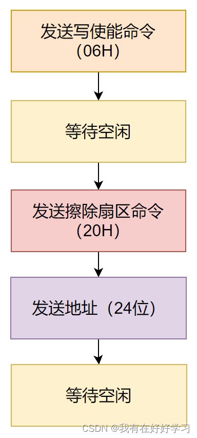 | 0X20 | 扇区擦除 | 扇区擦除指令,最小擦除单位(4096字节) |