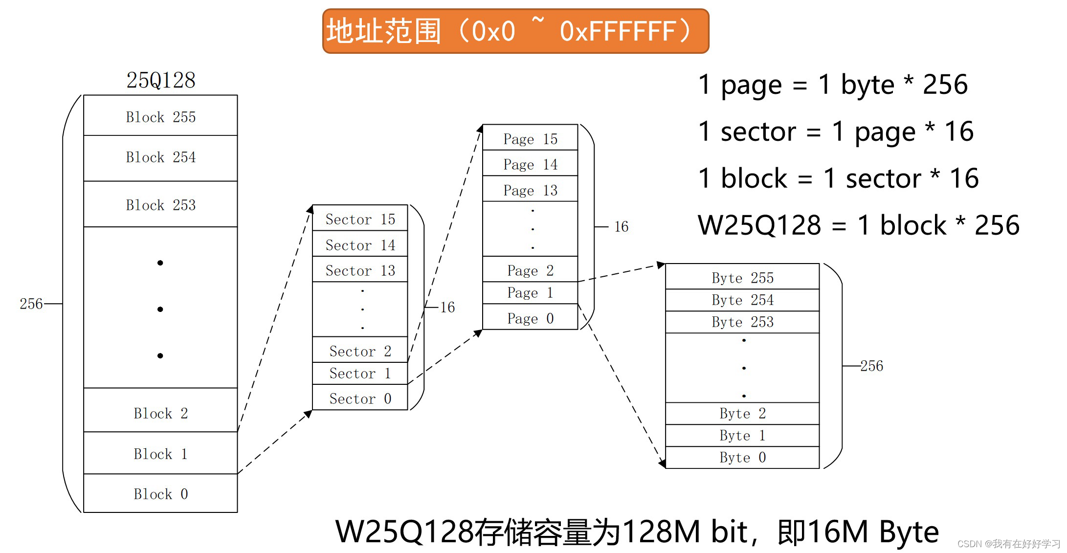 W25Q128 是华邦公司推出的一款 SPI 接口的 NOR Flash 芯片,其存储空间为 128 Mbit,相当于16M 字节。