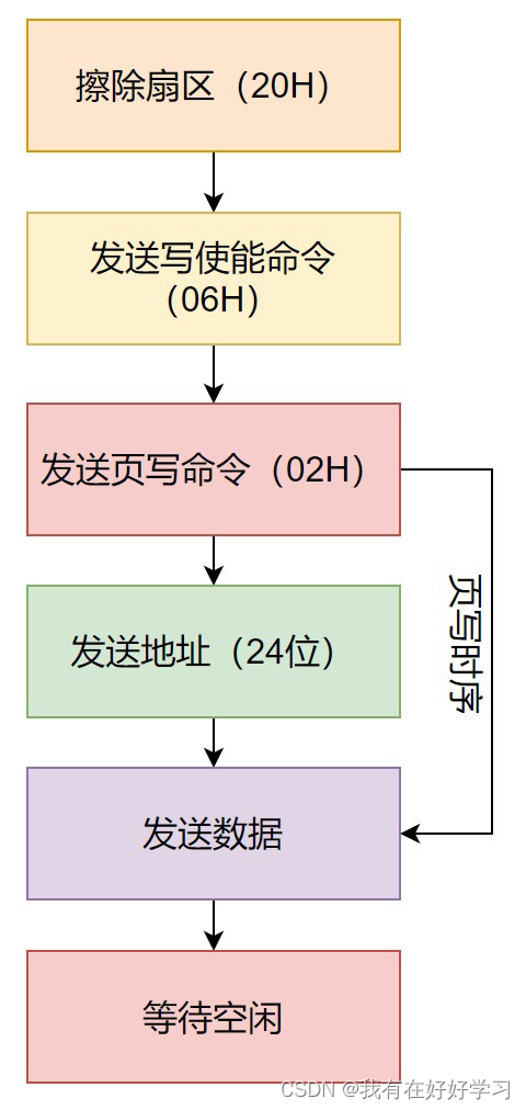 执行页写,扇区擦除,块擦除,片擦除,写状态寄存器等指令前,需要写使能。