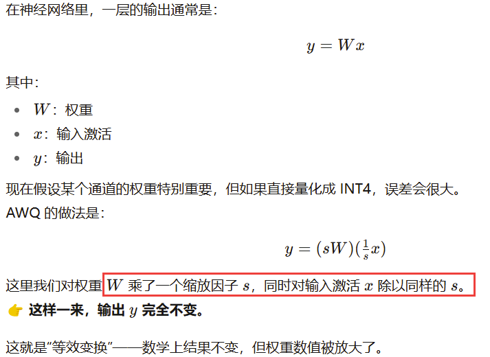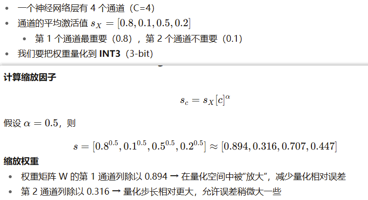 补充知识点:权重被放大,能让它们在量化时 “占的比例更大”,被 “四舍五入” 的幅度就会减小(相对误差降低)。只放大权重,输出就会变大,所以要同时在输入激活上乘一个 $1/s$ 来抵消,这样输出结果保持不变。