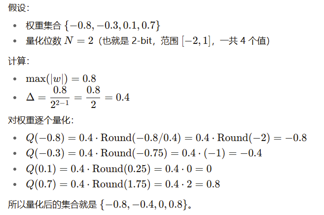 N是量化比特数,△越小量化误差越小,但能表示的范围有限,这里选择 时,让最大权重能正好映射到整数范围的边界(即利用好所有整数区间)