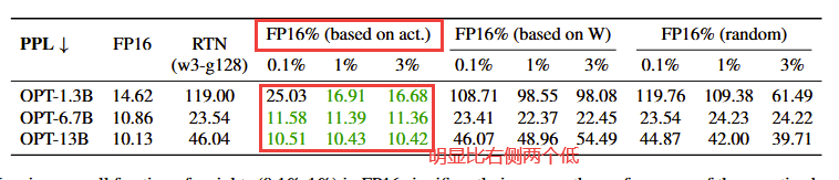 发现LLM 权重的重要性不均,存在少量关键权重对模型性能影响显著,跳过这些显著权重的量化可以帮助弥合由于性能下降造成的影响。---->做实验:测量了INT3量化模型的性能,同时保持FP16中一些权重通道的比例【通过权重幅值或 L₂ 范数判断重要性】---->发现:表1基于权重幅值选择关键权重(FP16% based on W)效果与激活值随机选择接近,无法显著提升量化性能----->改进:选择激活值幅值大的权重通道(对应处理重要特征的权重),可显著提升性能(表 1 绿色高亮结果)。