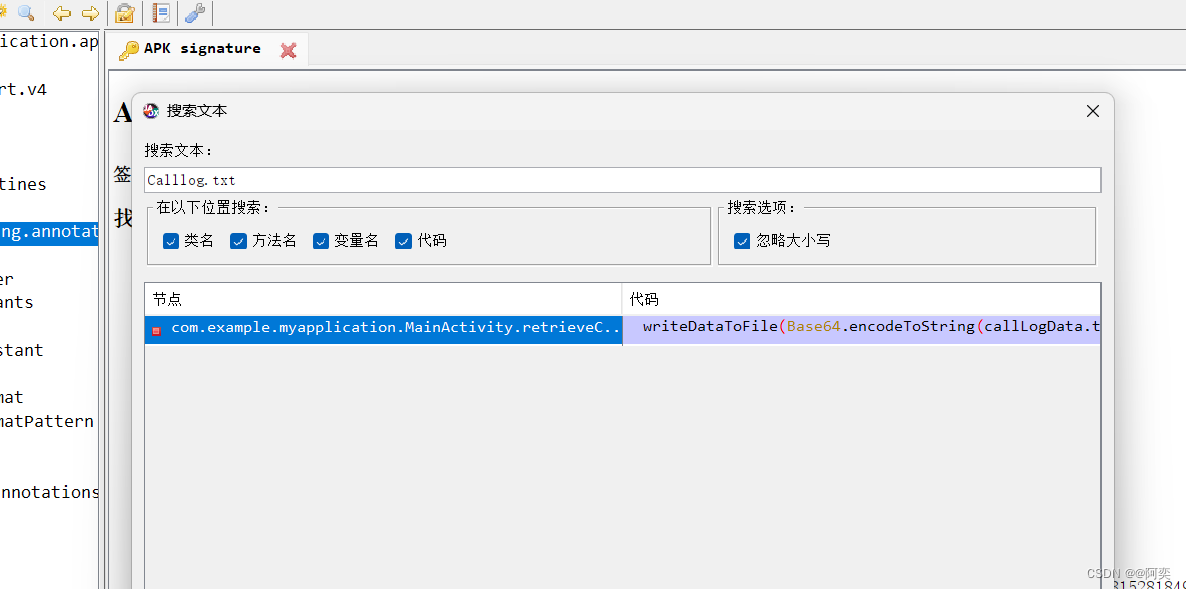 我们是在jadx里面找到的,这里我们需要搜索一下就可以找到这个文件了,就可以看到是base64加密了,但是做题的时候我认为它只是一种编码方式,然后就填了另外一个。比赛之后调整了规则,大小写都可以了。