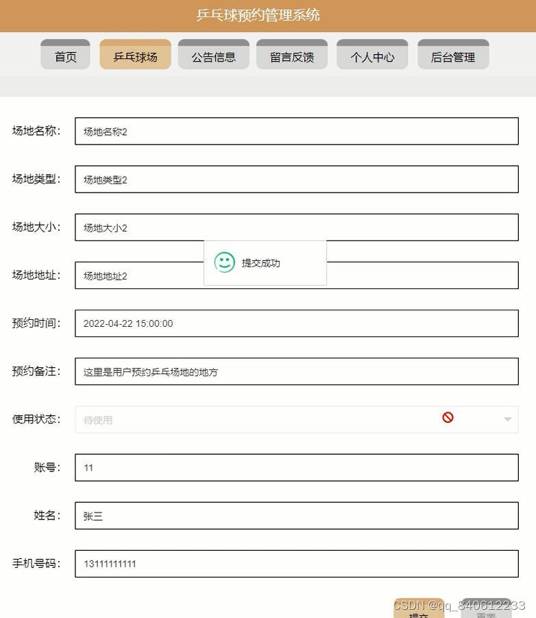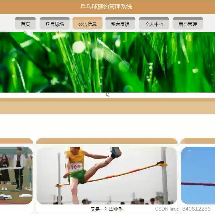 前台功能:用户进入系统可以实现首页,乒乓球场,公告信息,留言反馈,个人中心,后台管理等功能进行操作;