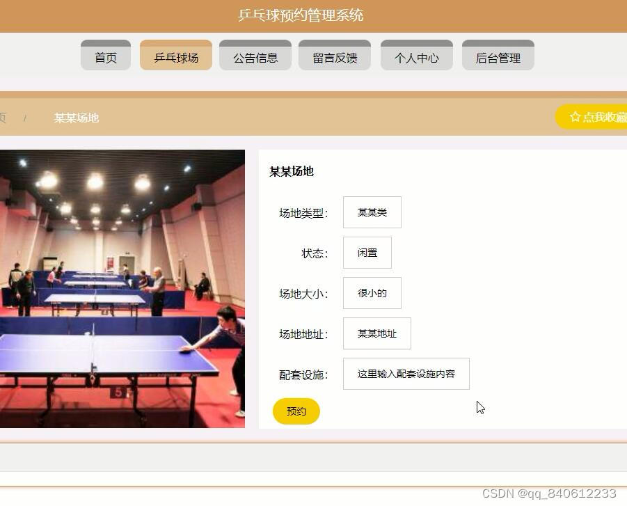 在乒乓球场页面中可以查看场地名称,场地类型,状态,场地大小,场地地址,配套设施、封面等内容;并进行场地预约,收藏操作;