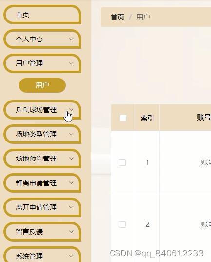 后台由管理员和用户,主要功能包括首页,个人中心,用户管理,乒乓球场管理,场地类型管理,场地预约管理,暂离申请管理,离开申请管理,管理员管理,留言反馈,系统管理等功能;