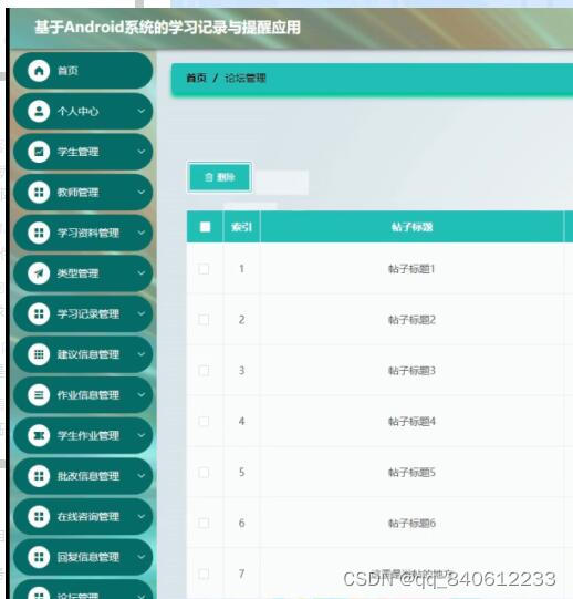 系统管理,在轮播图管理页面可以对索引、名称、值等内容进行详情,修改等操作,还可对公告信息进行详细操作本学习记录与提醒应用管理系统主要包括三大功能模块,即学生功能模块和、教师功能模块管理员功能模块。