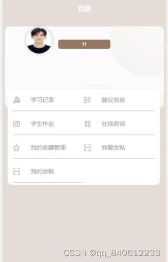 学生,在我的页面可以对个人中心、学习记录、建议信息、学生作业、在线咨询、我的收藏管理、我要发帖、我的发帖等详细信息进行操作