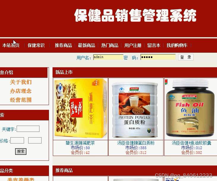2.后台部分由管理员使用,主要包括管理员身份验证,保健品管理,订单管理,会员管理,系统管理。