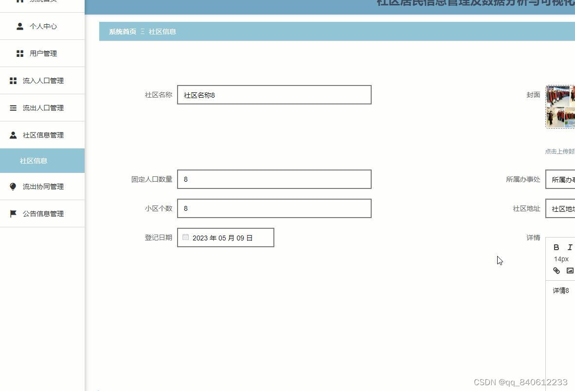 社区居民信息管理及数据分析与可视化系统利用python框架开发的一款web系统,数据存储到MySQL中,社区居民端前台使用Html技术对界面进行设计和实现。本文先充分调查社区居民信息管理及数据分析与可视化系统的需求分析,深入剖析系统应该具有的功能,并设计完善的数据库。利用成熟的开发技术完成编码工作,最后进行投入前的测试工作。最终,完成前台和后台的社区居民信息管理及数据分析与可视化系统的功能,主要包括社区居民管理、流入人口管理、流出人口管理、社区信息管理、流出协同管理、公告管理等,通过前后台实现数据的传递。