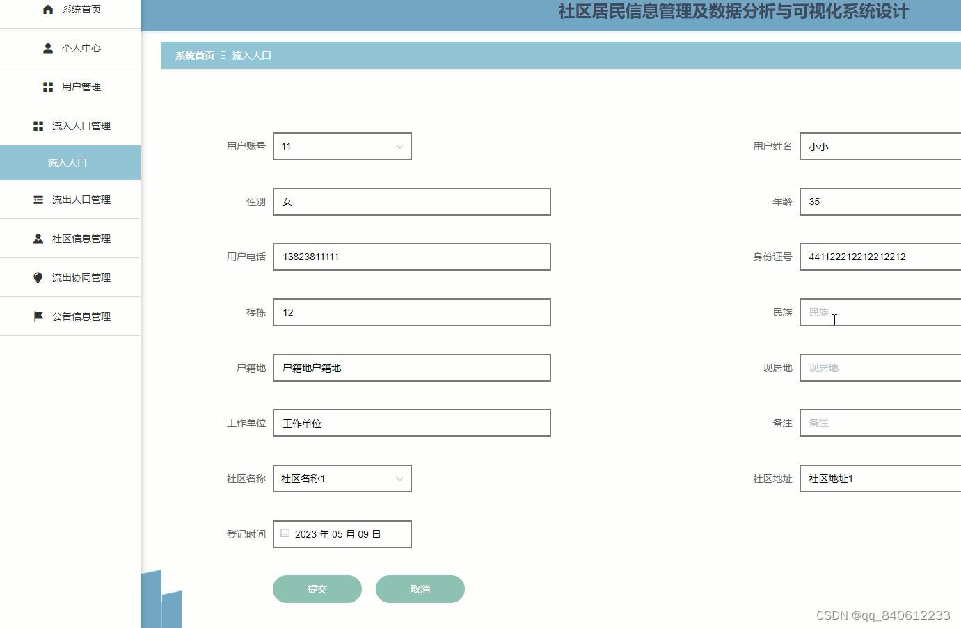 流入人口管理、流出人口管理、流出协同管理,管理员对社区居民的流入、流出进行管理,记录流入、流出信息,并对流入、流出数据进行修改或者删除操作。通过流入、流出信息,可视化统计出对应的图表,包括流入人口统计、流入年龄统计、流入楼栋统计、流出人口统计、固定人口统计。