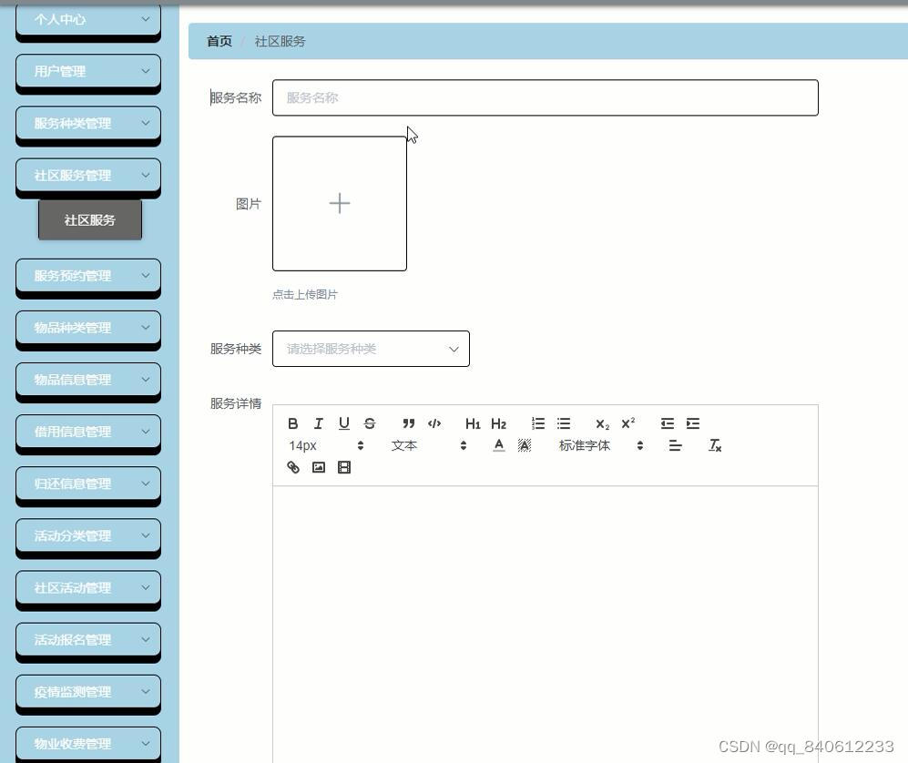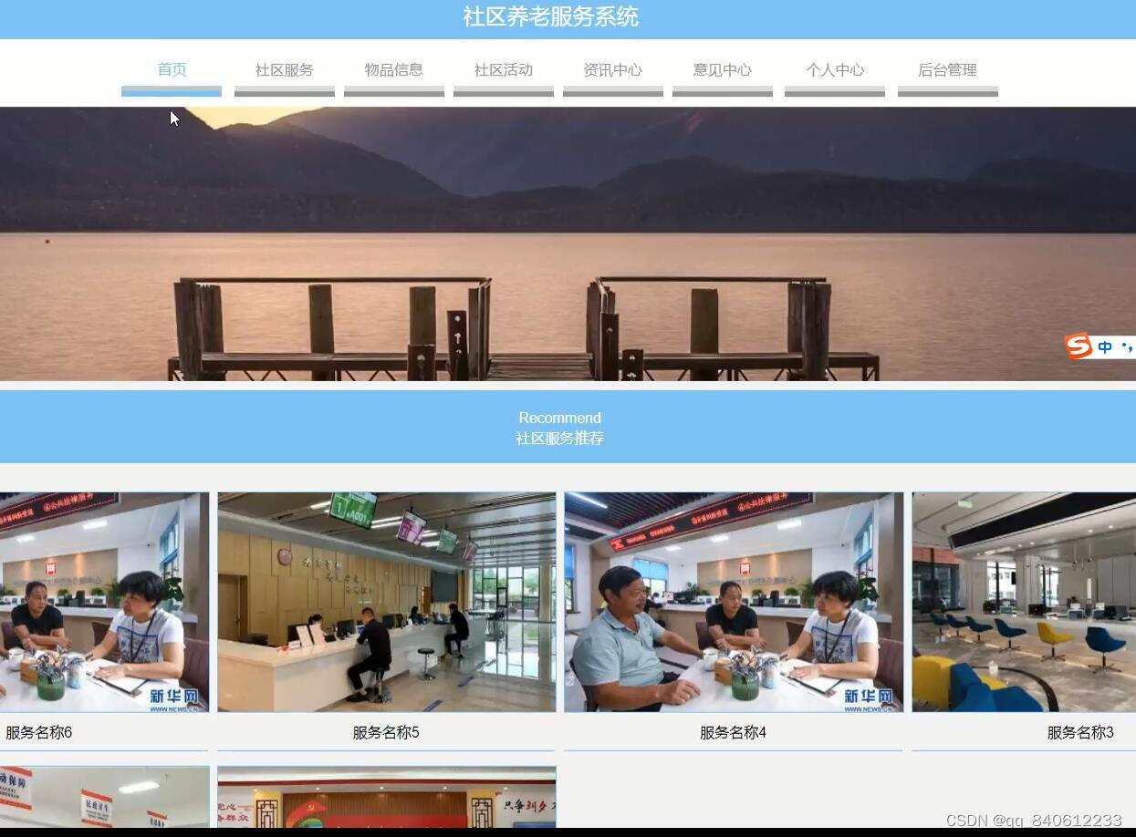 社区养老服务系统有管理员,用户两个角色。管理员功能有个人中心,用户管理,服务种类管理,社区服务管理,服务预约管理,物品种类管理,物品信息管理,借用信息管理,归还信息管理,活动分离管理,社区活动管理,活动报名管理,疫情监控管理,物业收费管理,资讯中心管理,意见中心管理,系统管理。