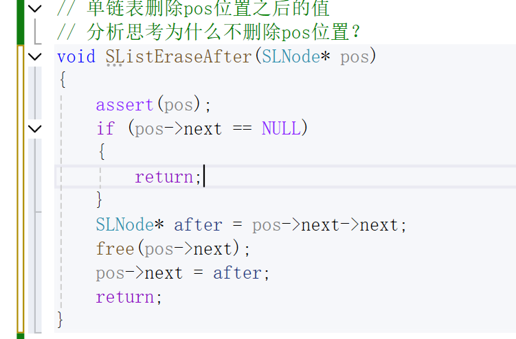 单链表删除pos位置后的数据,这时候要注意!如果pos后是空,那就不需要删啦,直接返回就可以了。
