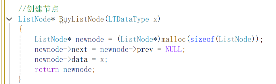 然后写一个创建节点的函数,后面儿插入节点时,用着就会十分方便,这儿我省略了对newnode的判断,一般他都是创建成功的,但是尽量加上呢