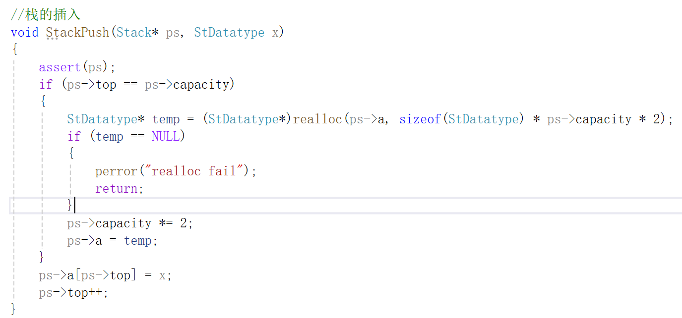 栈的插入,这块儿就要和动态顺序表一样,考虑满的问题,我是定义top为0,并且先插入数据再top++