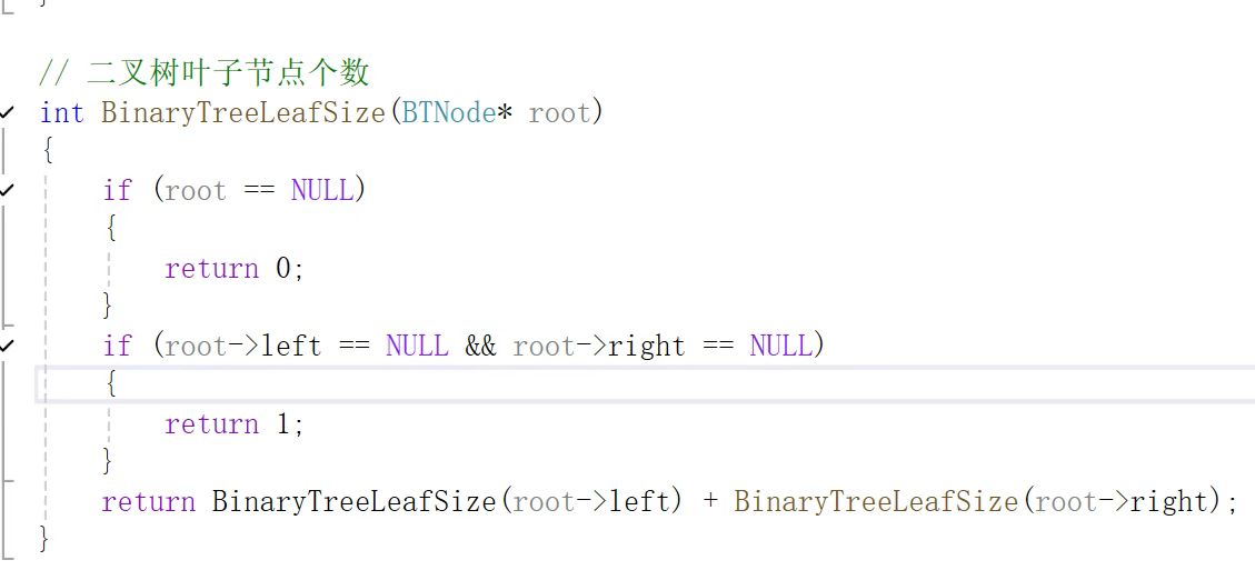 他的左右子树只要都=NULL,那就是叶子节点了嘛,那就这个情况下,返回1,然后统计左右子树的情况呗~