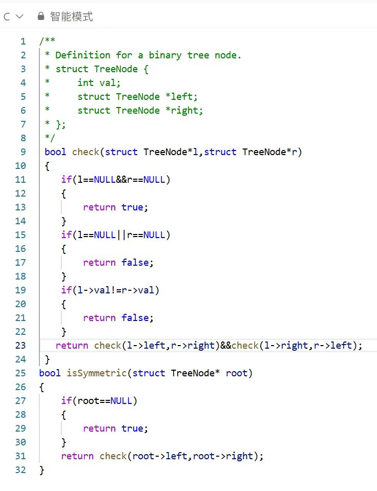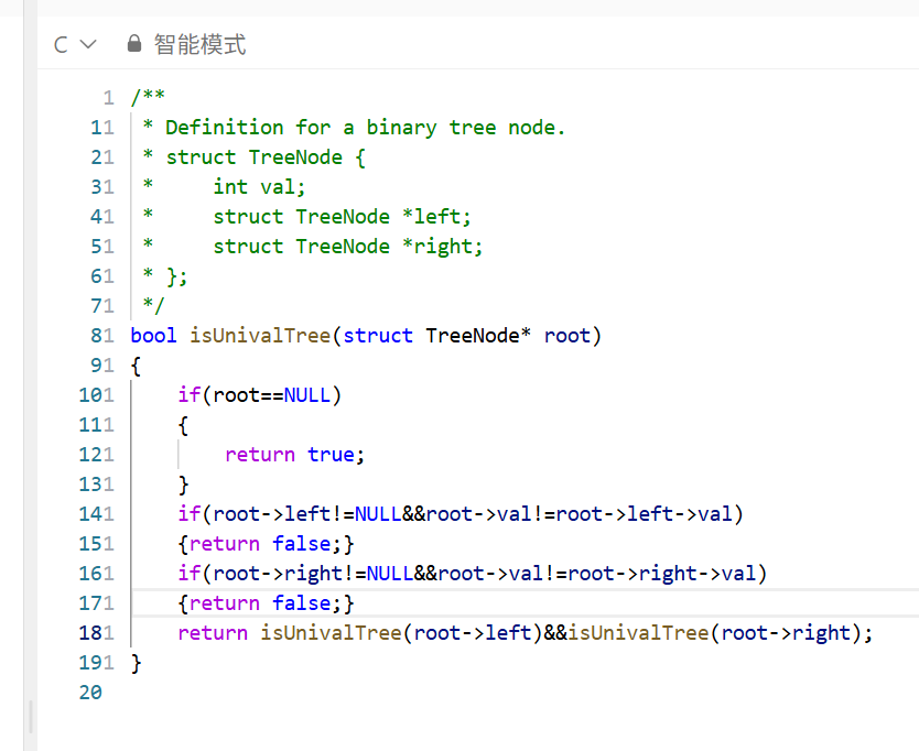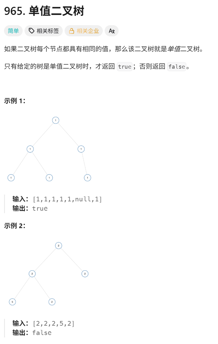 相同的值,那不就是父节点的分别和左右孩子的val相等就行了嘛,相等就继续往下走,但是,如果不想等,就返回一个false呗,最后要是走到结尾root=NULL,那不就是对喽~全相等嘛,然后最后的返回值,思考一下,是不是他的左右子树都必须是true,才能是完全的单值二叉树!