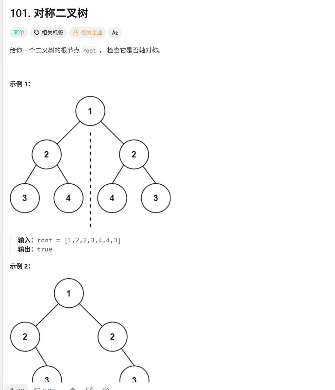 检查他是否轴对称,大概思路就是,一个从左边儿走,一个从右边儿走,然后就和检查两个树是否一样有点类似了,如果左和右都能走到空,那就证明左右对称嘞,如果只有一个为空,或者值不相等,那就不对称啦,返回false就完事儿啦