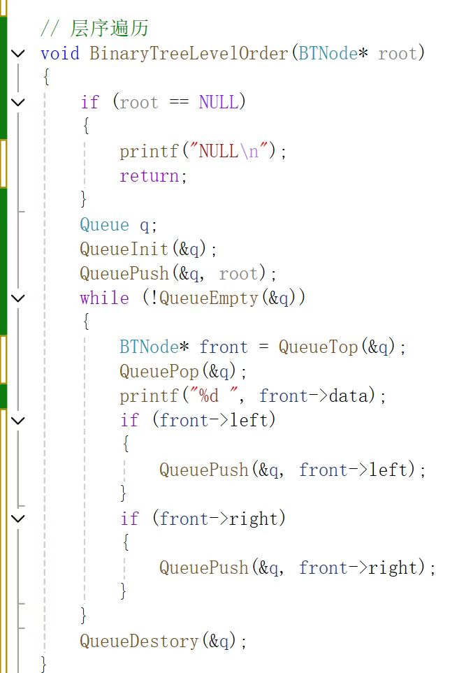 最后就是层序遍历啦,这个借助了队列的特性,先创建一个队列昂,先把根节点放进去~然后取根节点,打印,再放入这个根节点的左右孩子,如此循环往复,大功方可告成
