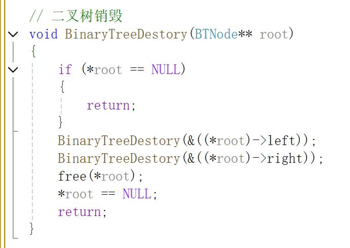 分别销毁左右子树,最终释放根节点,这儿也可以传一级指针,但是就没办法将root置空,得在外面儿手动置空呢