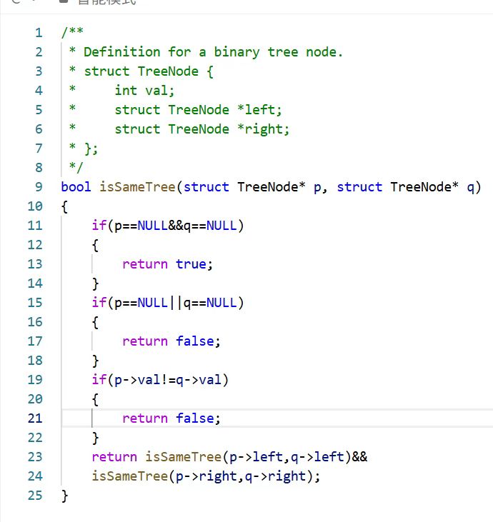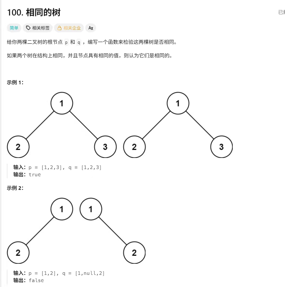 判断两个树是否相等~这个也比较简单呢,如果两个都走到NULL,那不就是相等嘛,返回true,如果只有一个空或者值不想等,直接返回false就行啦~