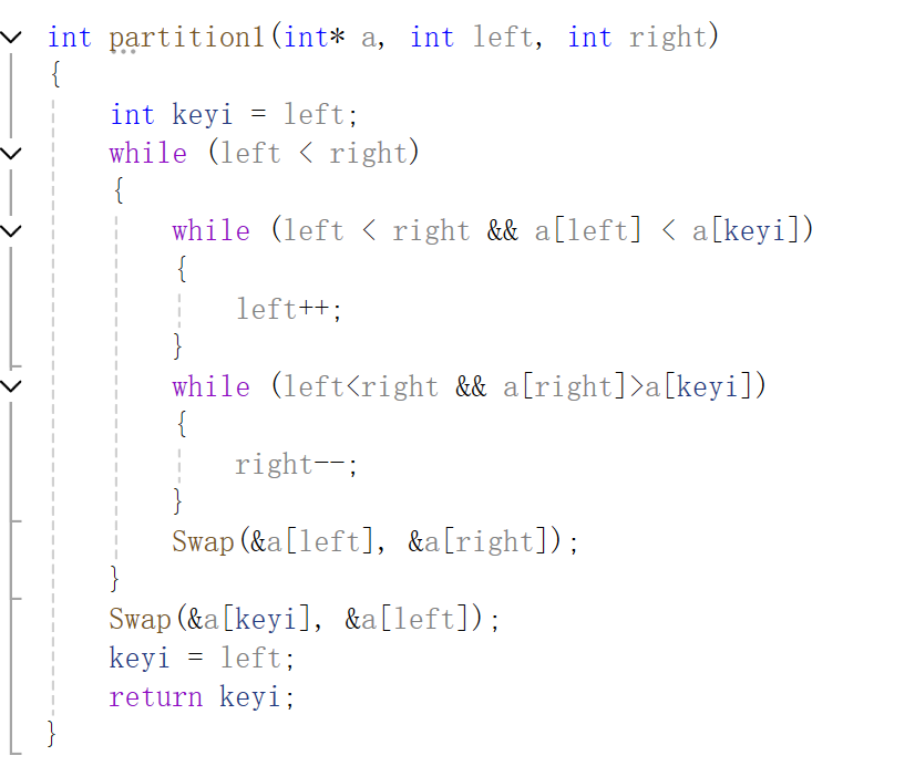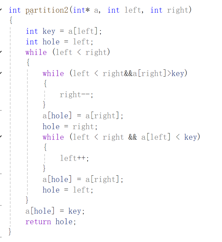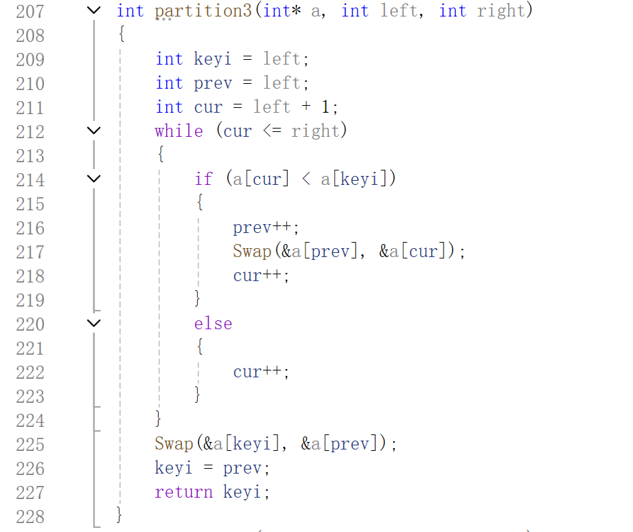 他是定义了一个前后指针,从开始最左边儿遍历,这时候前后指针都在最左边儿,然后开始遍历,如果比目标数小,那么前后指针都++,如果大,那么只加++前指针,最后前后指针的区间,就是比目标数大的啦,然后后面指针的都是比目标数小的,最后交换现在的后角标的数,和目标数,最终大功告成