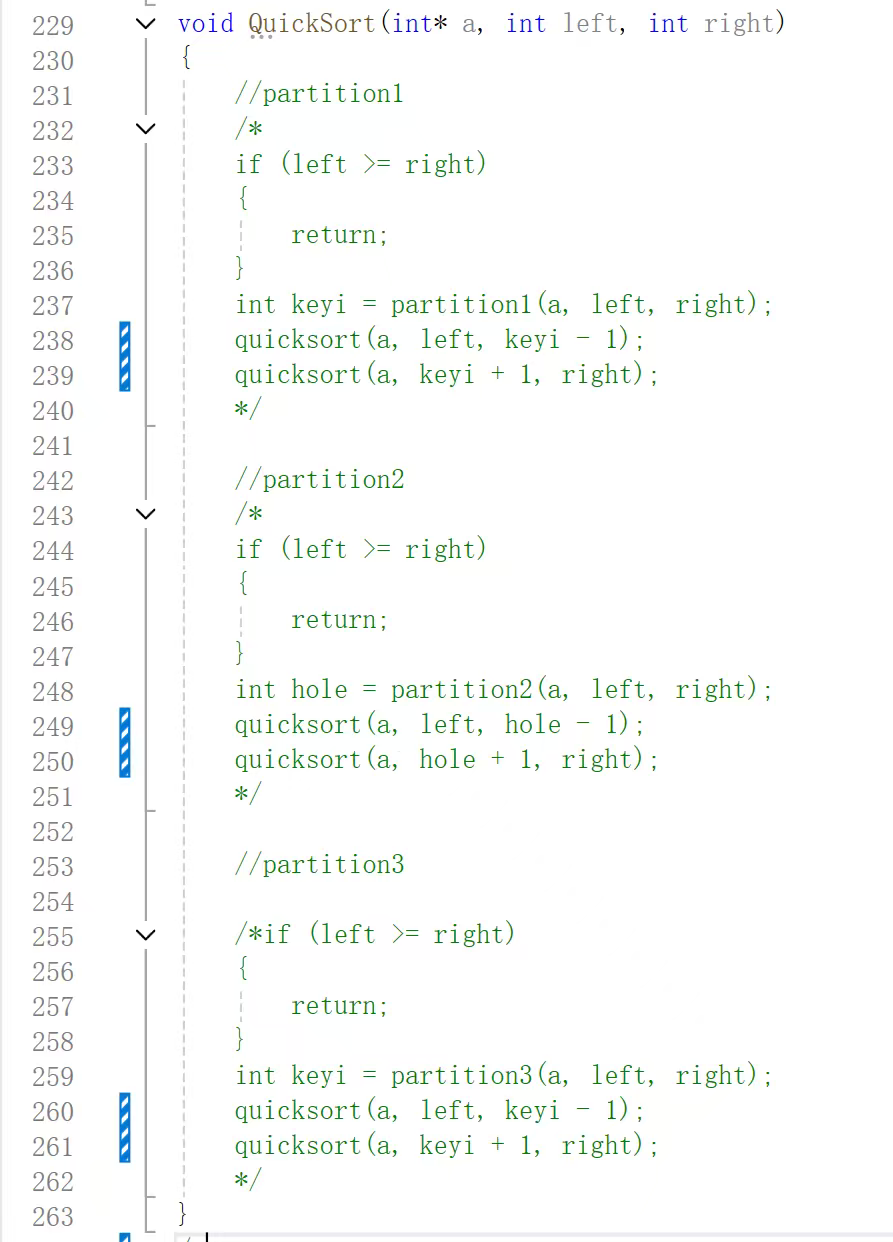 这是第一种,他其实就是从左边儿开始找一个比目标数据大的数,再直接从右边儿找,找比目标数据小的数,然后两个再交换(注意交换的是数本身!不是角标昂),然后继续找,依次类推,直到左角标等于右角标,甚至右角标小于左角标,再跳出循环,交换目标数据和当前角标的正确值,最终返回目标数据的角标,他就在最终应该呆的地方啦,然后从左边儿,右边儿,依次递归,最终排序成功