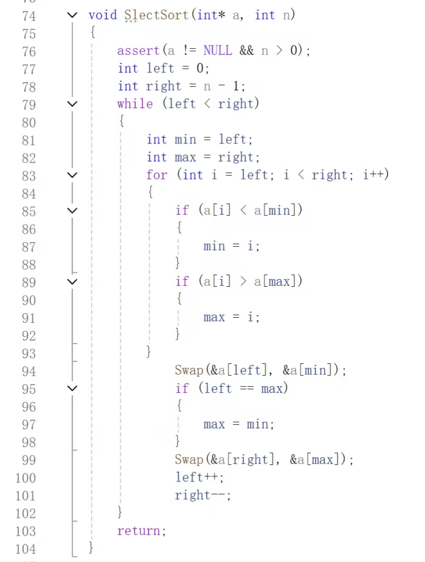 选择排序比较简单,我这个是两端都开始呢,左边儿最小,右边儿最大,同时走,也能相对快一点儿,先都把最左边儿的定义为最小和最大,然后遍历数组,比较值,不断更替最小数的角标,最后交换,但是!注意!这有一个坑。如果你最小值的角标本来是最大值,然后你交换了之后,那么最大值位置也就改变了昂!此刻就得调整一下了