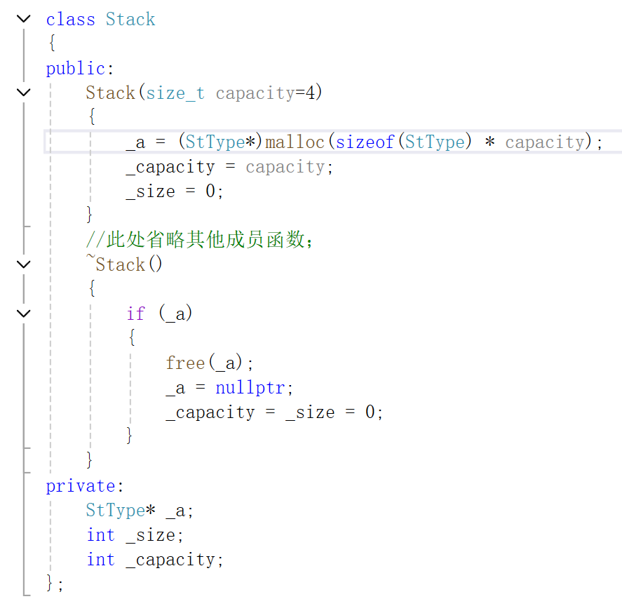 这块儿就写了Stack的构造函数和析构函数,这里你看~这个析构函数其实跟咱们之前写的StDestory挺相似的,但是之前咱写栈的时候,你要考虑各种可能突然终止的情况,再必须调用StDestory,如果不调用,那么就会产生内存泄露,但是析构函数就不一样啦,它会在每次函数生命周期结束的时候自动调用!就很棒~