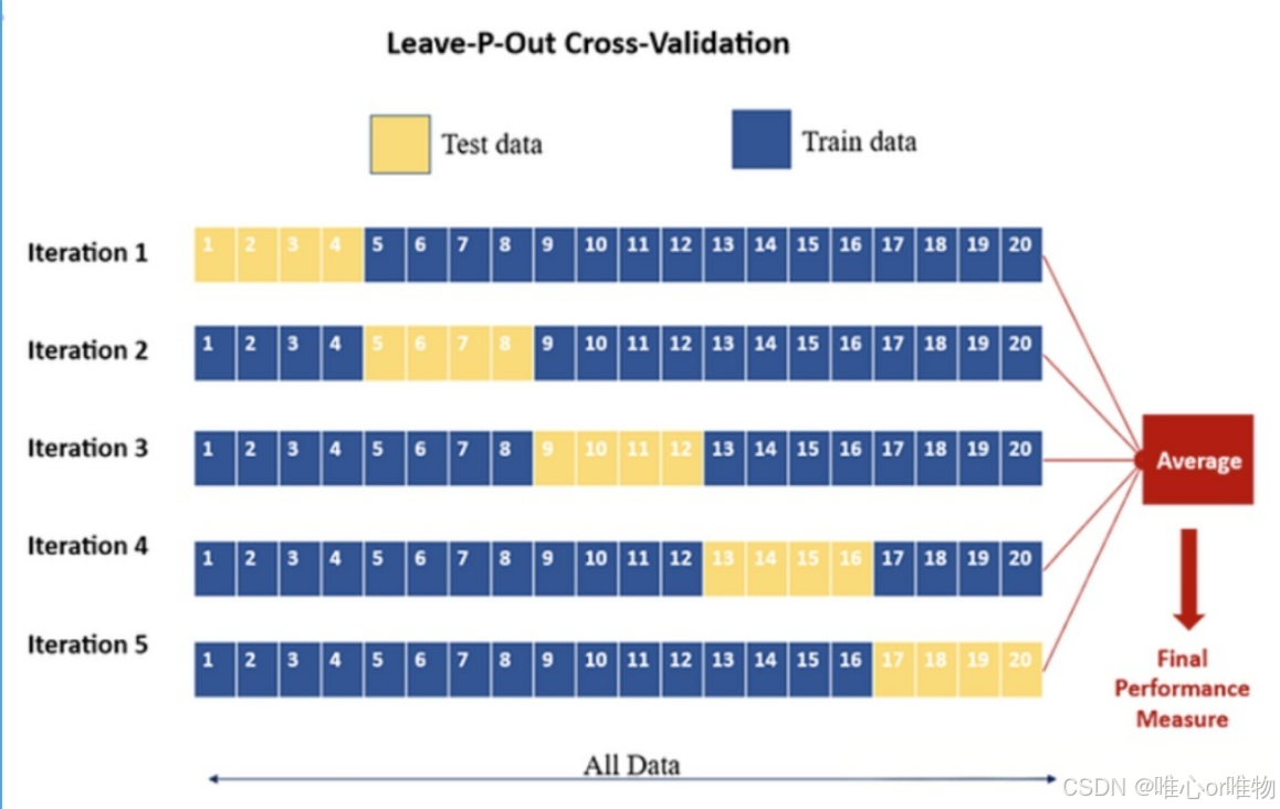 这是 LOOCV 的一个泛化版本,每次保留 p 个样本作为测试集,而剩余的样本作为训练集。