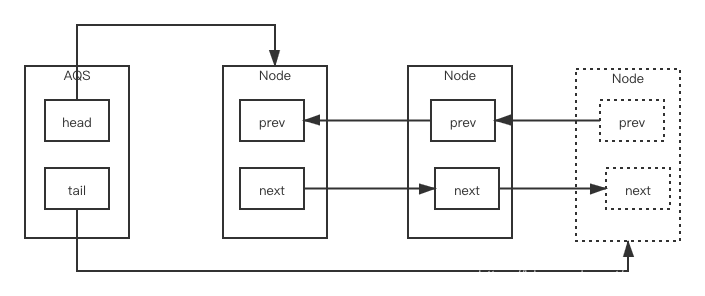 AQS队列内部维护的是一个FIFO的双向链表,如下图。这种结构的特点是每个数据结构都有2个指针,分别指向直接前驱节点和直接的后继节点。这种结构可以从任意的一个节点开始很方便的访问前驱和后继节点。每个Node由线程封装,当竞争失败后会加入到AQS队列中去。