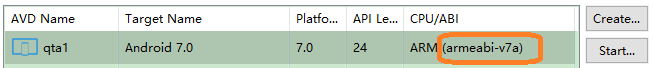 sdk下载完后,还需使用AVD Manager.exe手动创建一个AVD,后面Qtcreator中才会出现这一步,否则即使使用Add按钮也会提示有cannot create a AVD for ABI armeabi-v7a,实际上已经有下载的,欠缺的是要手动创建一个AVD。见下下图。