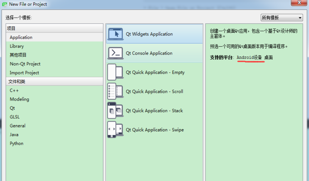 [文件]->[新建文件或项目],选择Qt Widgets Application,可以看到支持的平台包括:Android设备