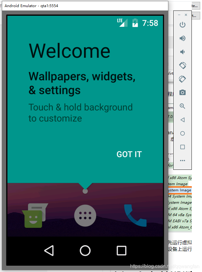 创建好虚拟设备后,需要先运行虚拟设备。然后再编译代码,编译的时候会提示你选择挂载的设备,选择刚创建的虚拟设备,编译后,运行,会自动在虚拟设备上运行你的程序。下图是运行起来的虚拟设备。