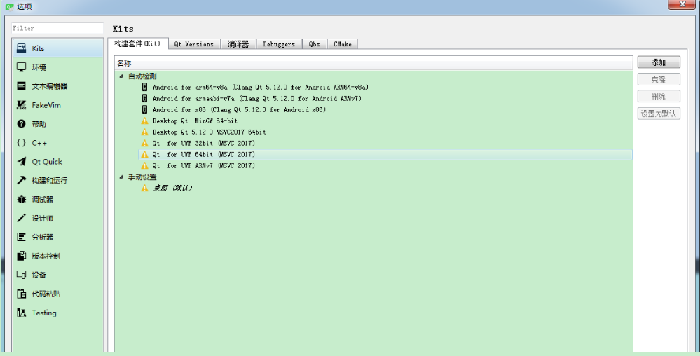 正确配置应用后,转到“Kits”中可以看到已经可以吧构建Android的套件显示出来了。