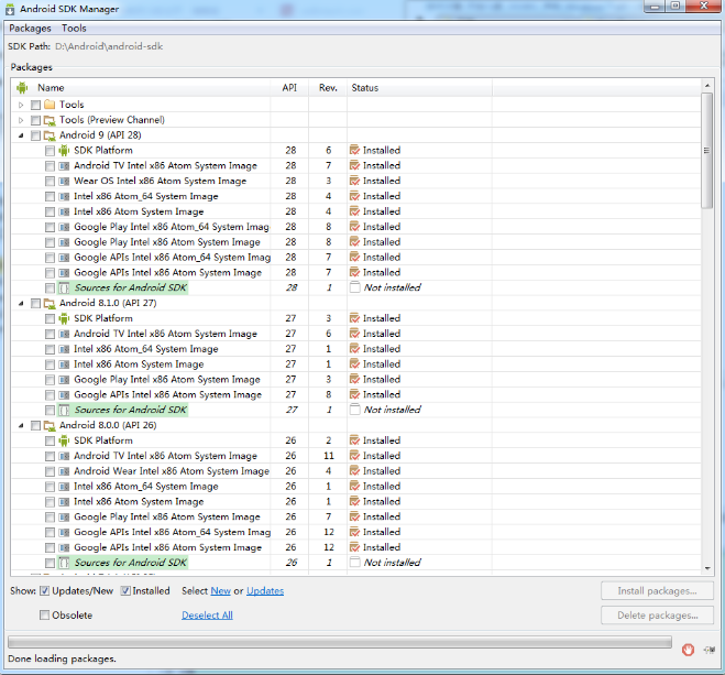 还有一种方法是直接下载SDK安装:installer_r24.4.1-windows.exe,运行安装目录下面的“SDK Manager.exe”,然后勾选安装,在方框的前两个中是必选的,之后的Build-tools最好是选择对应版本。对于安卓的版本我这里安装的是Android 8.0 (API 26)以上,你们可以自行选择。SDK下载完成后会占用较大的硬盘空间,请将其安装在空间充足的盘符中。(sdk下载安装需要比较长时间,如果网速快还好,否则要等好久)