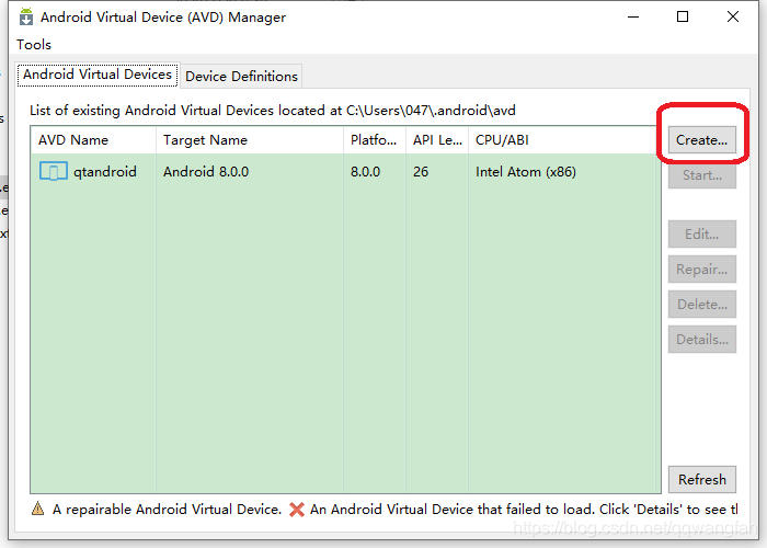 点开AVD Manager.exe点击Creatr按钮,创建一个AVD。