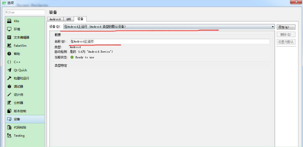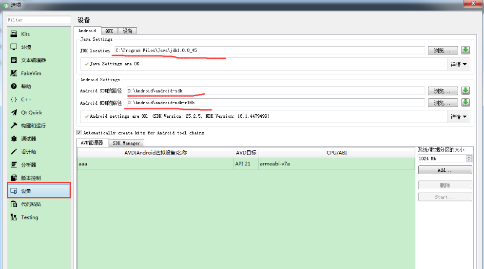 打开Qt Creater,菜单[工具]->[选项]->[设备]-“Android”以及“设备”,填写各项如下: