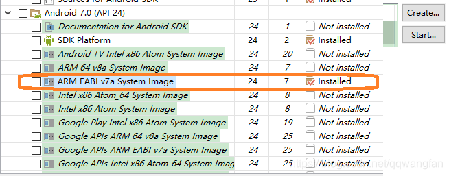 如果需要在虚拟设备上运行程序,则必须使用镜像armeabi-v7a,否则即使创建成功虚拟设备,起来后也会是一直黑屏。