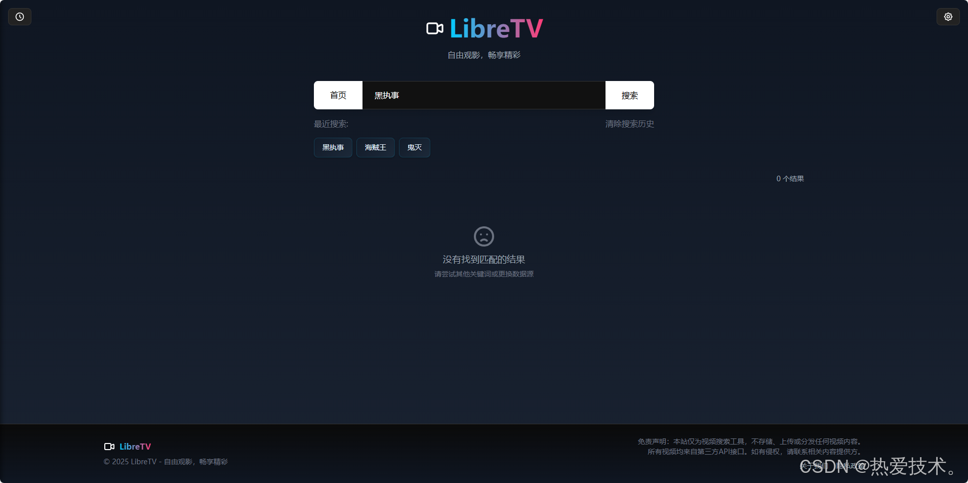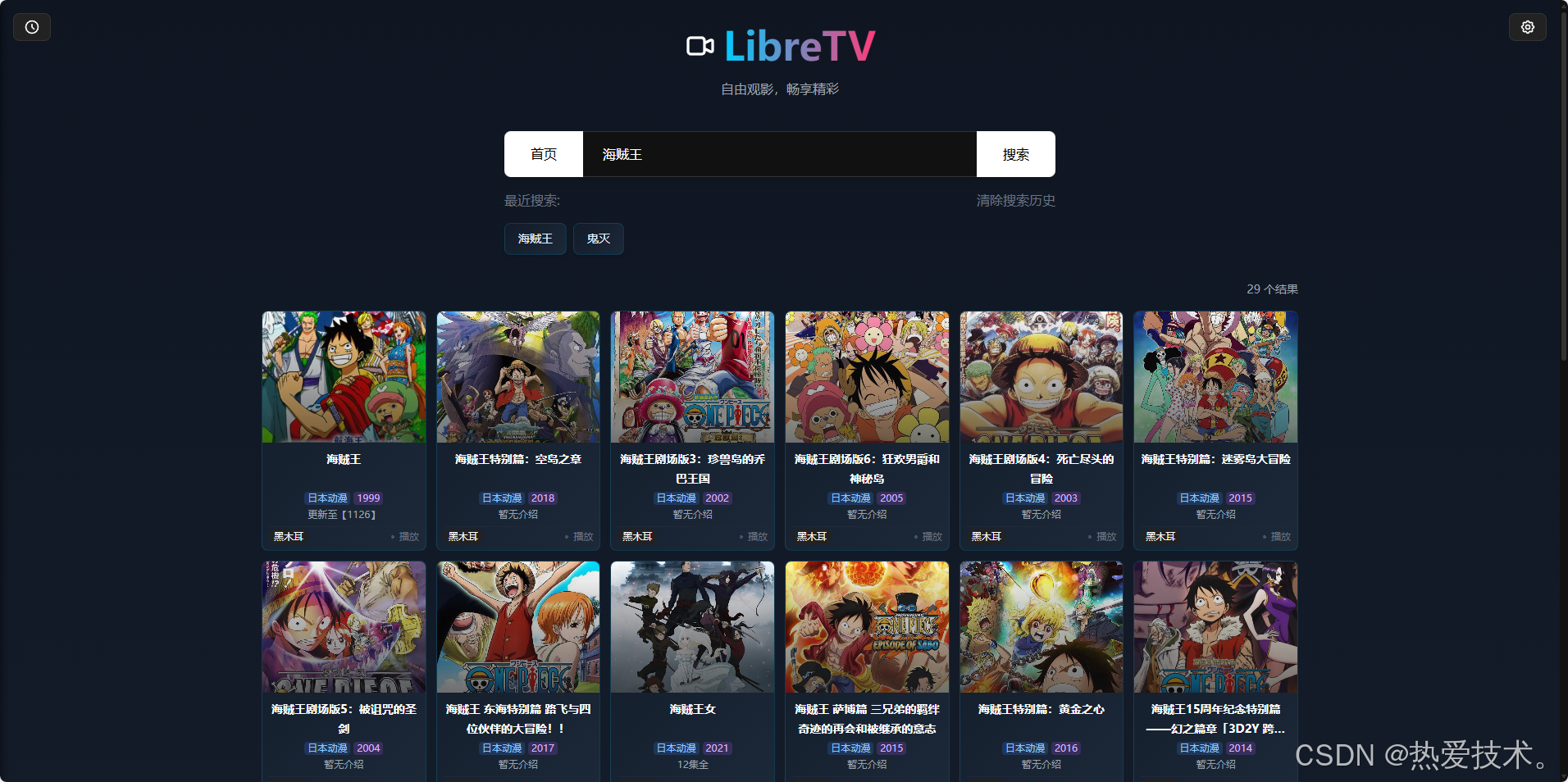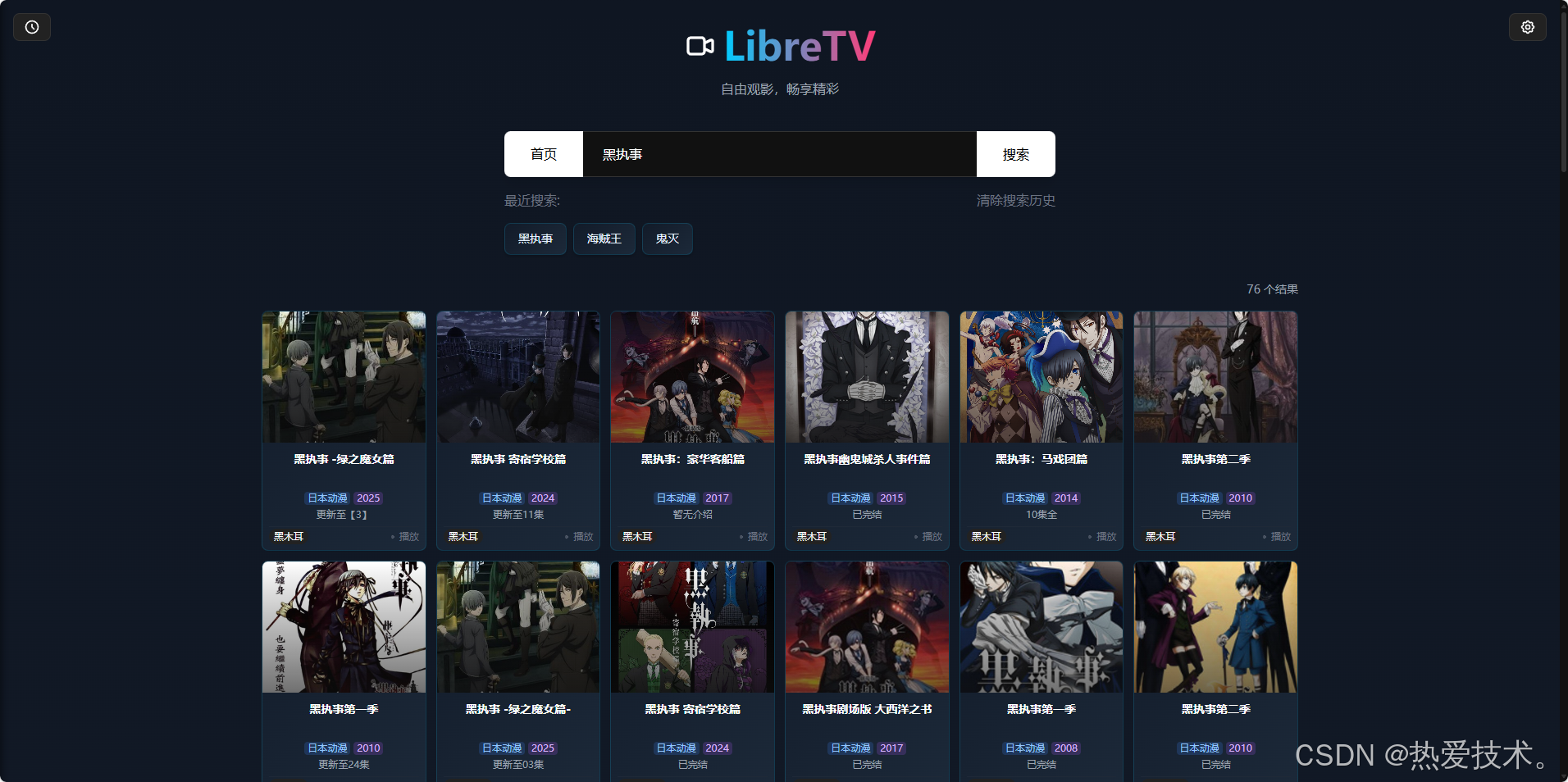 **LibreTV** 是一个基于纯前端技术构建的开源视频聚合平台。它就像一位贴心的管家,帮你从多个来源搜索和播放你感兴趣的影视内容,而且完全免费!无需注册,打开就能看,支持各种设备访问。