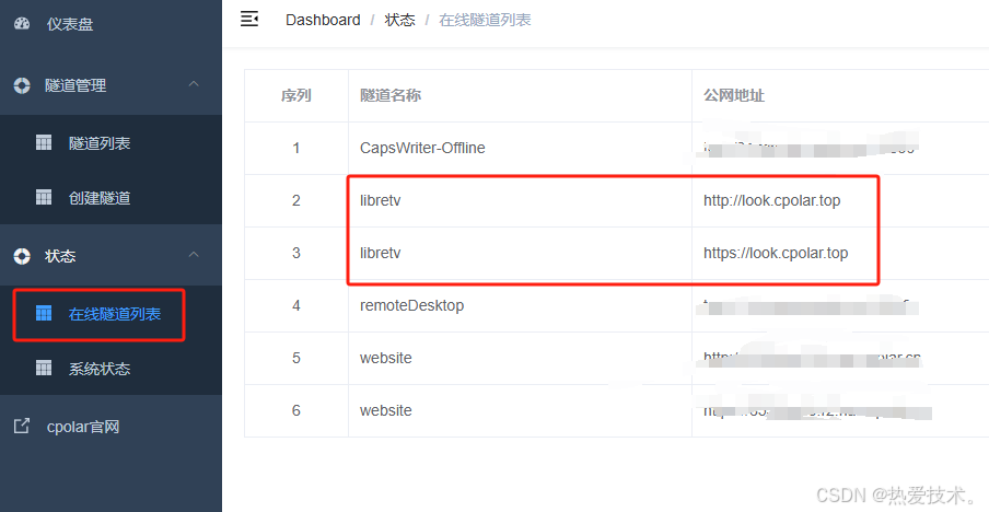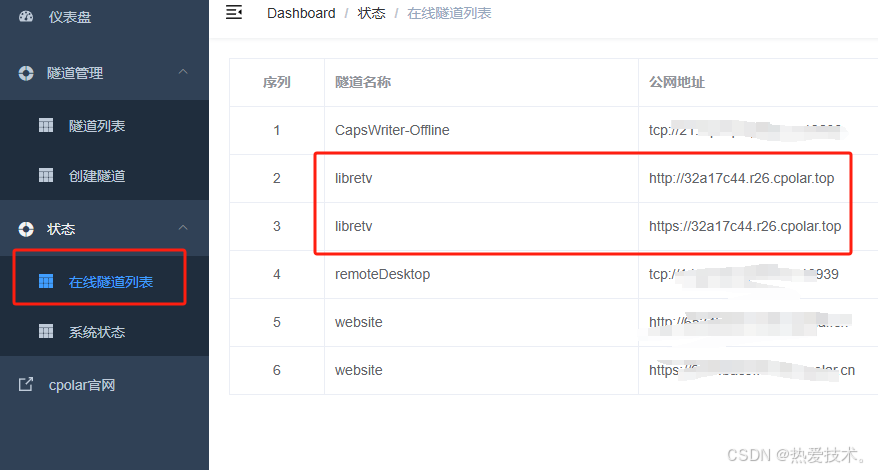 更新完成后,打开在线隧道列表,此时可以看到随机的公网地址已经发生变化,地址名称也变成了保留和固定的二级子域名名称。